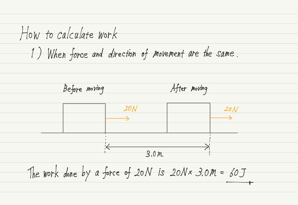 If the object is moving in the right direction in response to a rightward force as shown in the figure above, the work done by this force is calculated as “magnitude of force × distance traveled”.