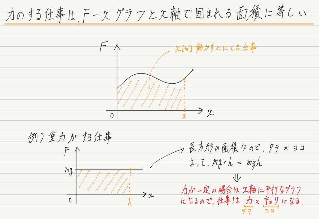 実は 力のする仕事はF-xグラフとx軸が囲む面積に等しいことが分かっています。
