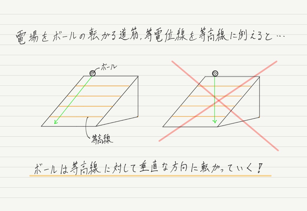 電気力線とは正電荷が動く道筋のことだったので,山の斜面を転がるボールの道筋をイメージすれば,電気力線と等電位線が必ず垂直になることは当たり前!!