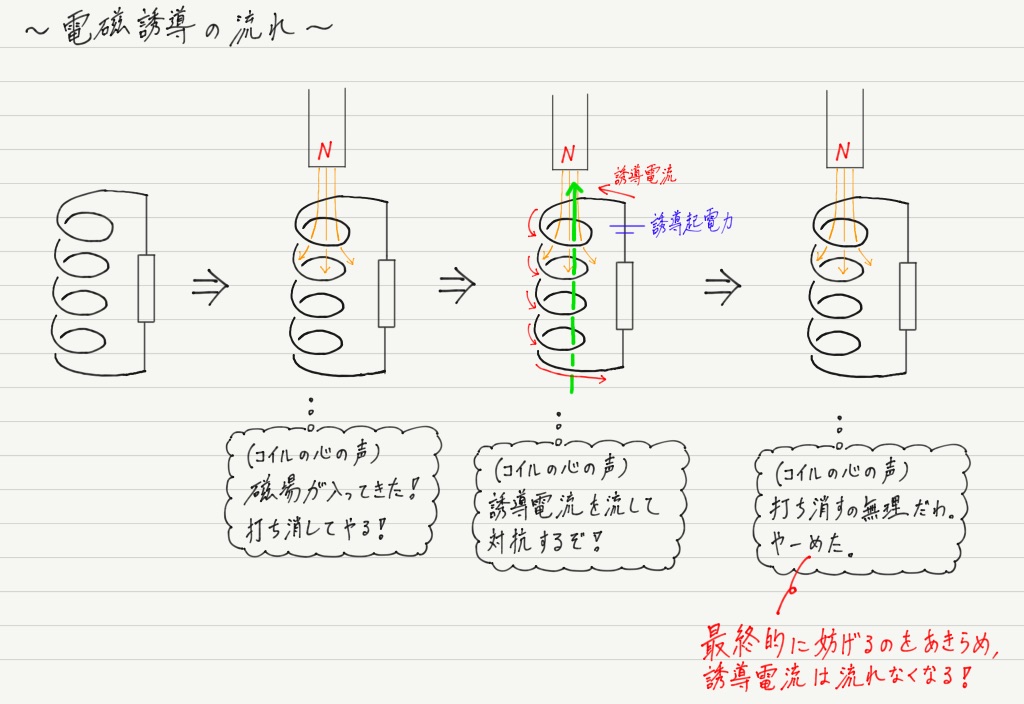 コイルは,内部の磁場が変化した瞬間は反抗する(=電磁誘導が起こる)けど,次第に変化を受け入れます。