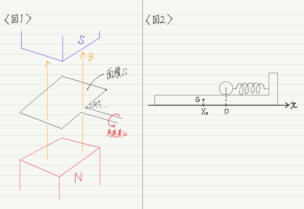 図1に示すように,鉛直上向きの一様な磁束密度Bの磁場中で面積Sの1回巻きコイルが一定の角速度ωで回転しており,時刻tにおいて水平面とコイルの面のなす角がωtであるとする。