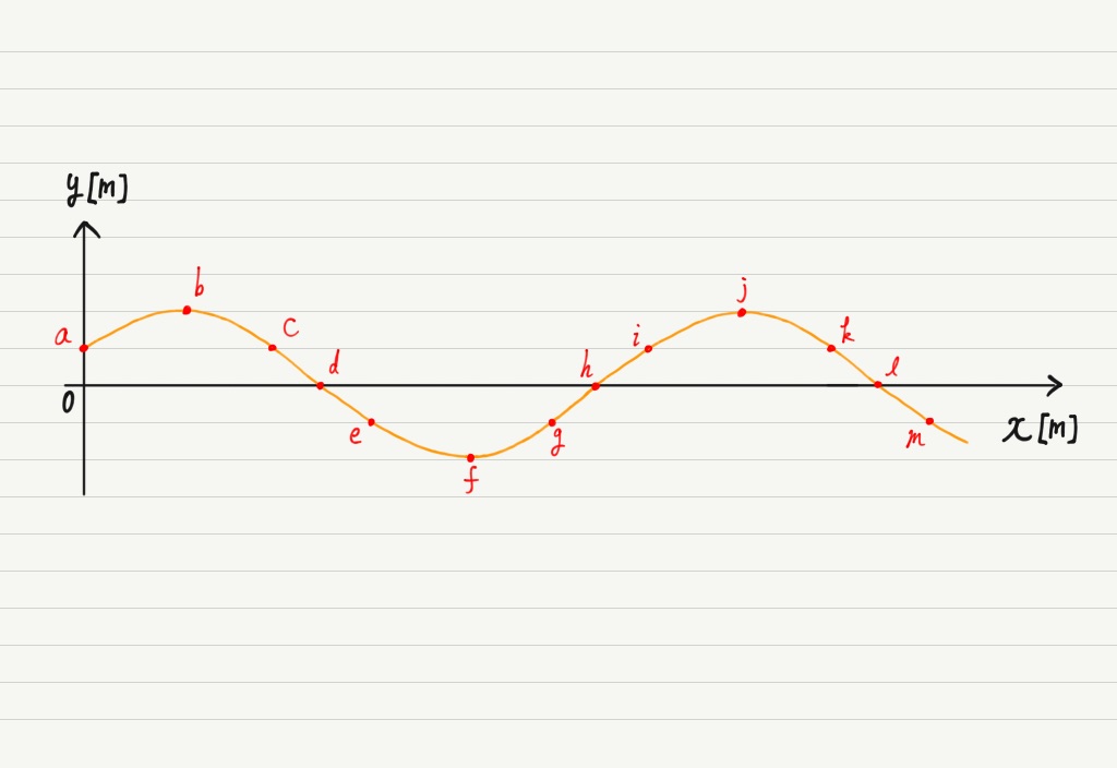 点a〜mのうち,媒質がx軸の正方向に変位している点はどこか。
