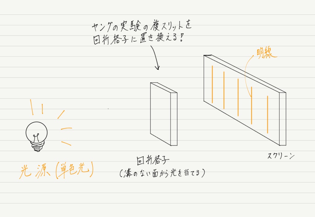 ヤングの実験ではスリットを抜けた光が干渉して明線をつくり出しましたが,スリットの代わりに回折格子と呼ばれるものを用いても明線が生じます。